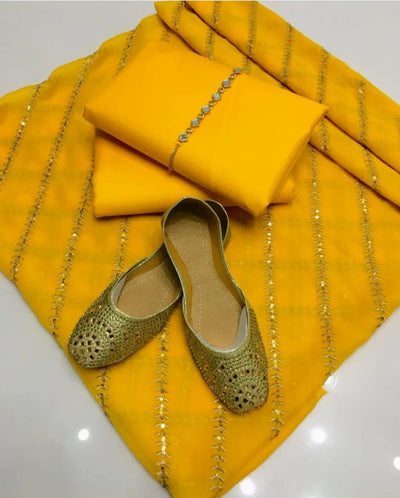 4 pcs Krinkal chiffon nug work Unstitched shirt Net mirror work dupata Meauri trouser Neck line Khussa