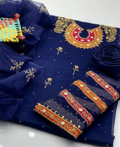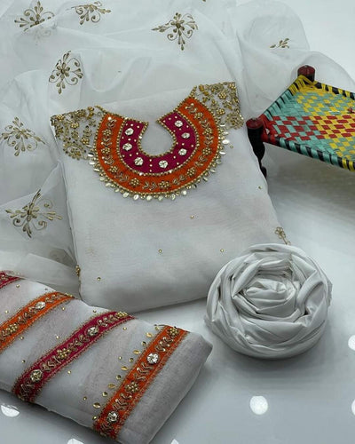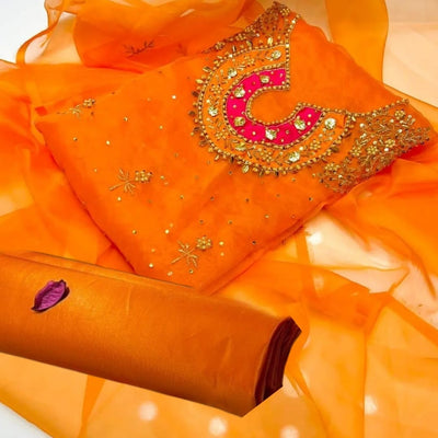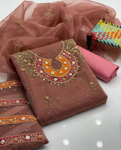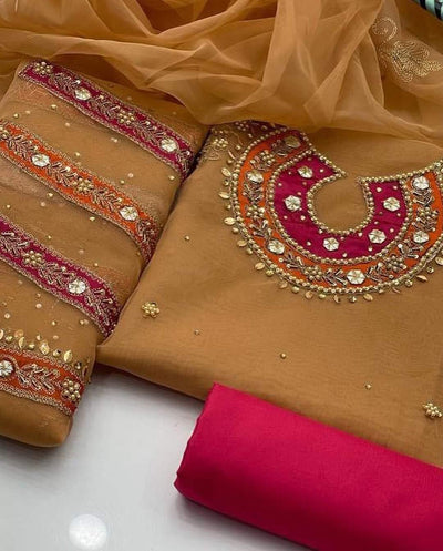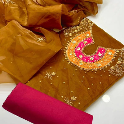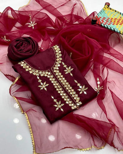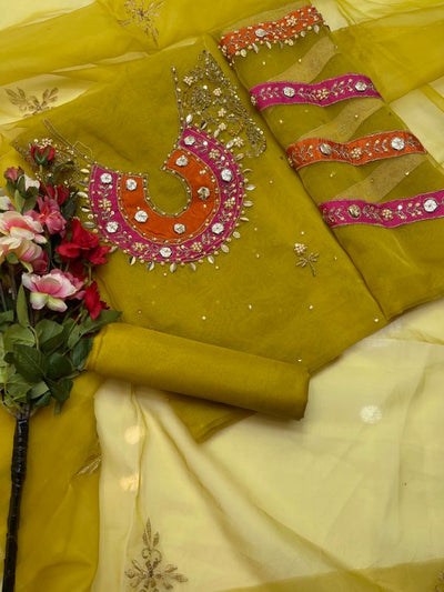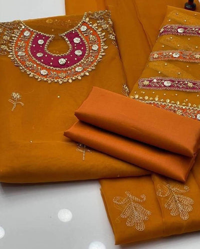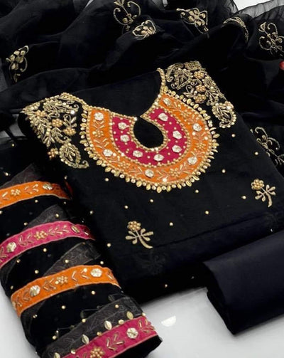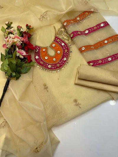 3 pcs organza apliq zari gotta work shirt and dupata Qattan silk trouser unstitched