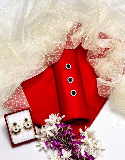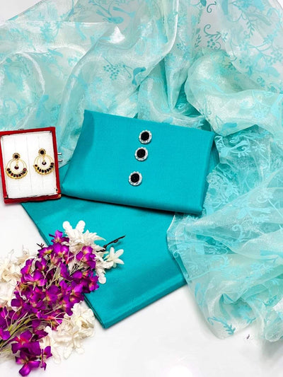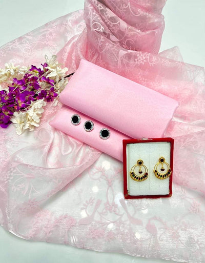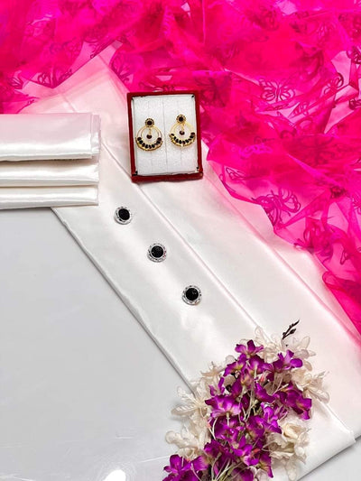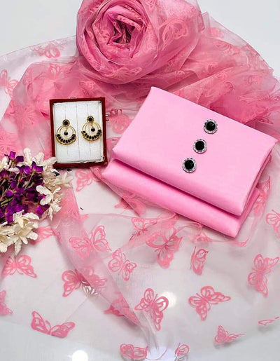 3 pcs Qattan silk shirt and trouser Organza beautiful print dupatta Buttons Earrings