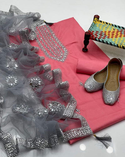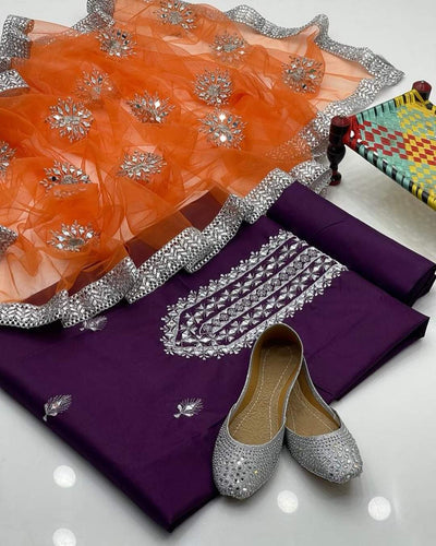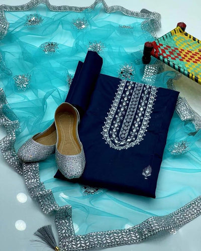 3 pice fancy suit Shirt silk katan mirror work Trouser silk katan Dupata net mirror work with free khussa