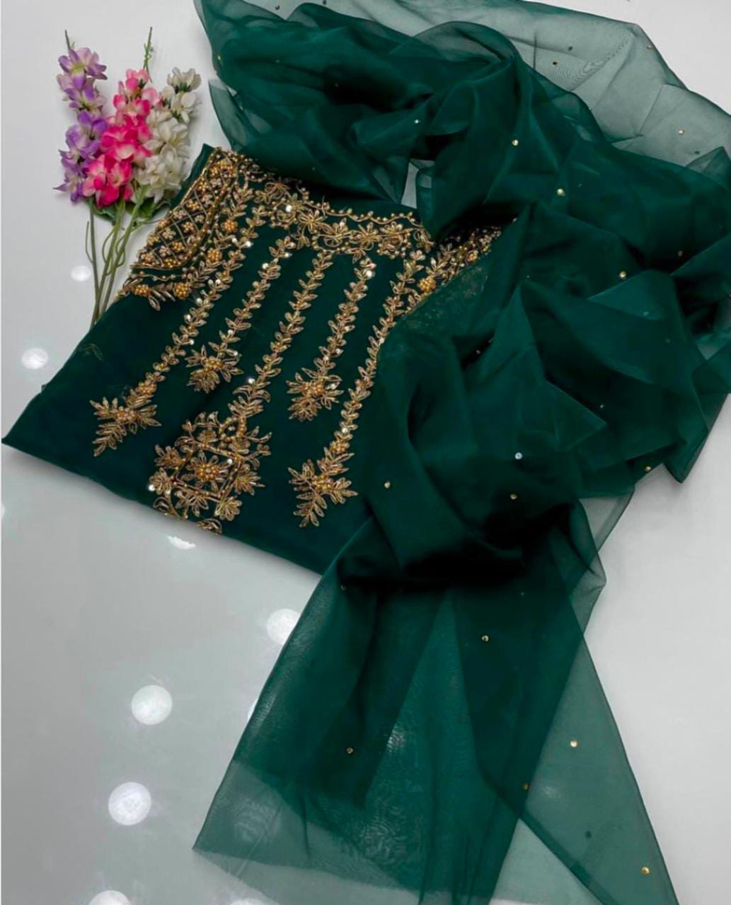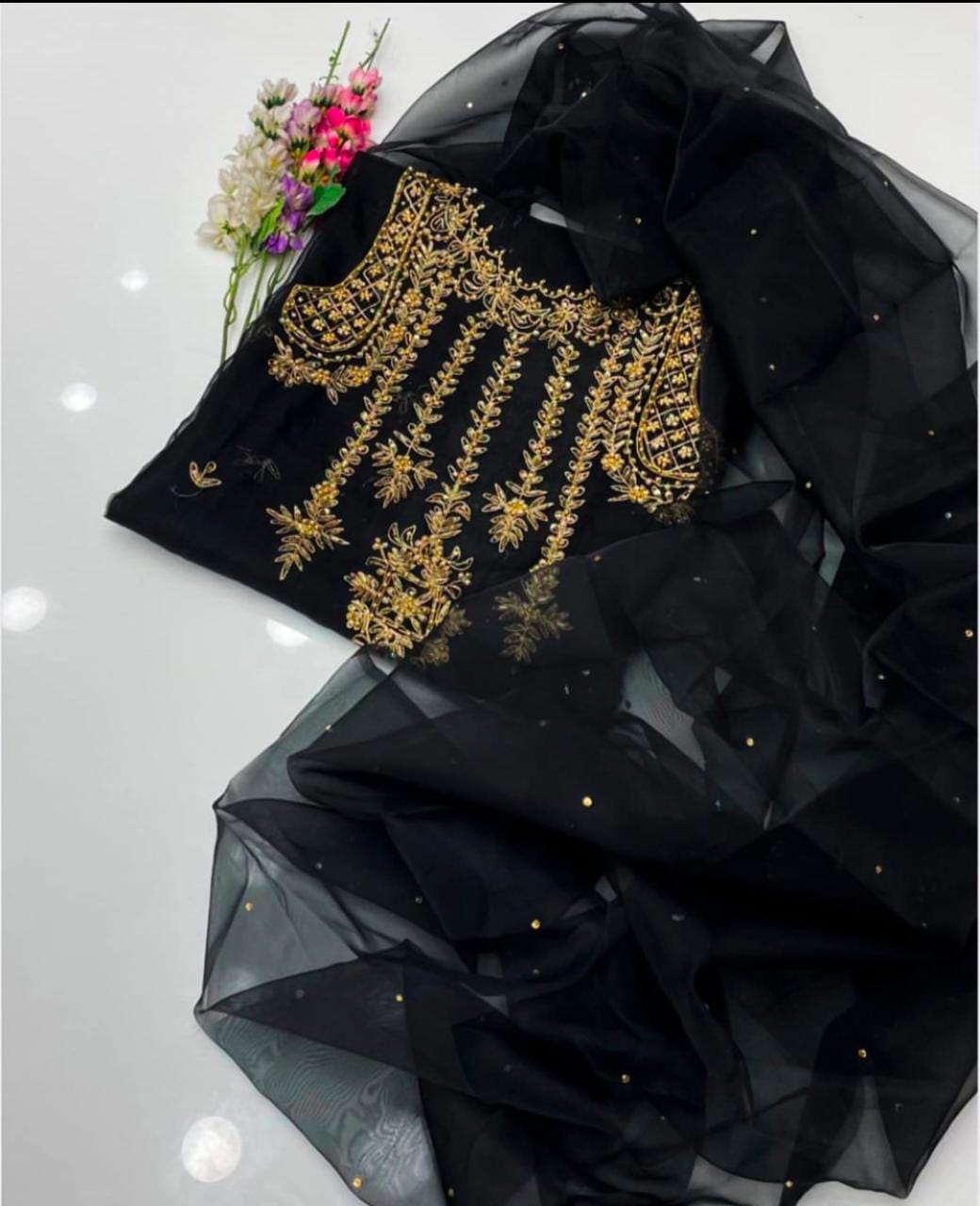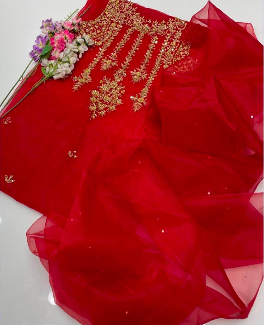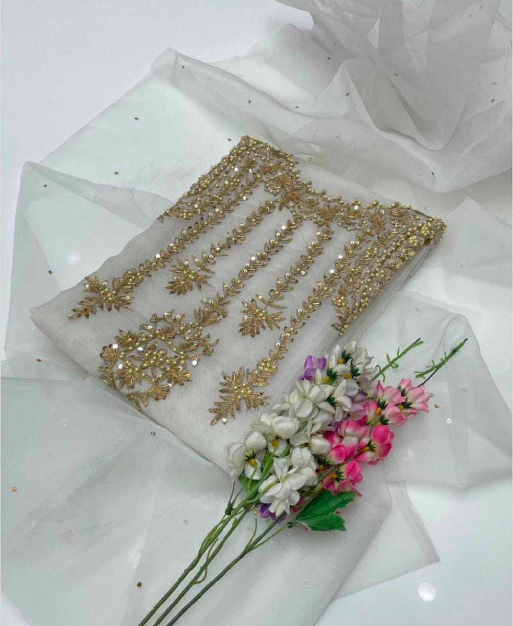 • Organza zari beads handwork shirt and dupatta